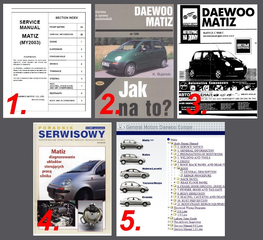 - Piaty návod je kompletný digitálny manuál celého automobilu okrem Matiza zahŕňa aj Daewoo Tacuma, Nubira, Kalos a Evanda. Predával sa zrejme na CD. Celý ZIP súbor má až 200MB a nemohol som ho dať na mediafire, takže musíte stiahnuť a nainštalovať program "BitTorrent" (bezplatný program na sťahovanie od iných užívateľov) a potom už len kliknite na GET THIS TORRENT na tejto stránke: