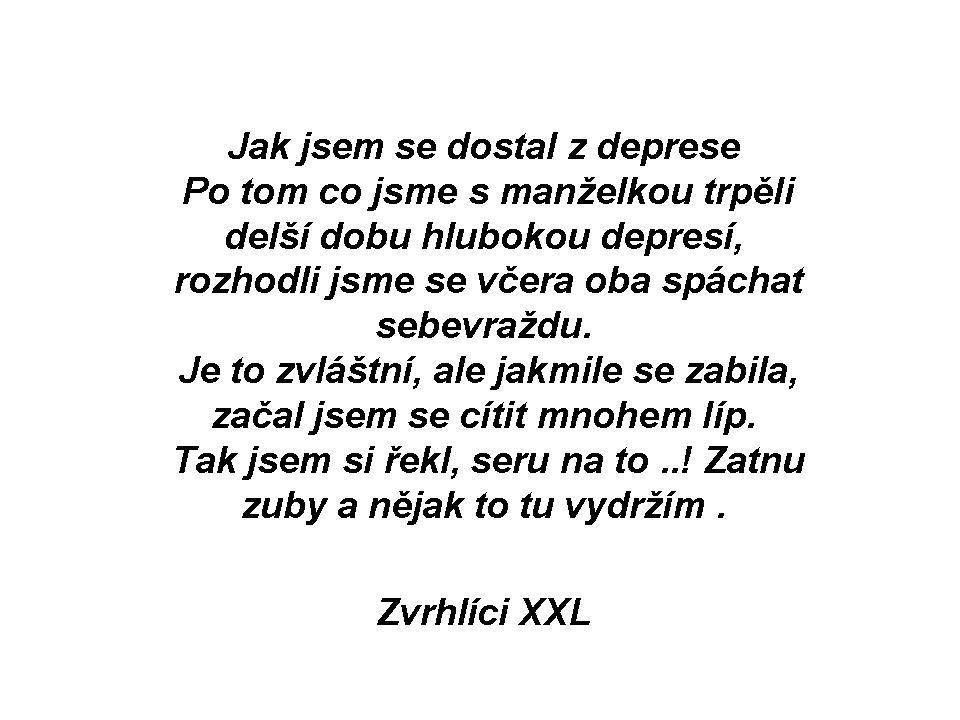 Paní Novákové přivezli uhlí. Vykloní se z okna jen v podprsence a ptá se, co to bude stát. "Dvanáct stovek, paničko." Paní Nováková vyhodí kozu z podprsenky a ptá se: "A nějaká sleva by bejt nemohla?" "Kdepak paní, to nejde." Jde tedy dolů jen ve spodním prádle, otevře, začne se nakrucovat, popotahuje kalhotky, až jí jsou chloupky vidět a znovu škemrá: "No tak, chlapci, pojïte na skleničku, dohodnem se na ceně." "Ne, ne, paní Nováková, to nepůjde. My už jsme dnes promrdali tři fůry." :-D :-D