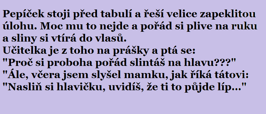 Přihlásí se debil Jáchym a říká:"Včera...pěkně.......pěkně",učitelka neví co si myslet,tak vyvolá Pepíčka a ten povídá: