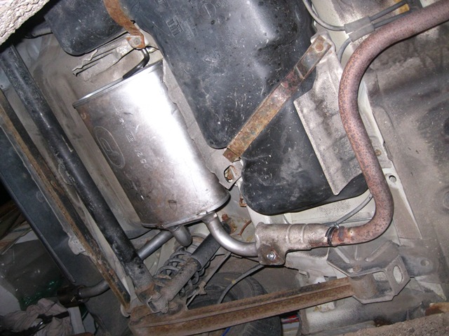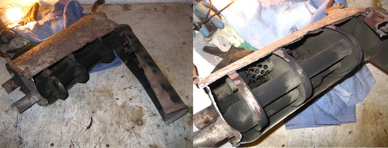 Tento piatok sme vymenili deravý výfuk. Zaujímalo ma, čo je vo vnútri tlmiča, tak sme ho rozpílili, je to na fotke. Ešte by som chcel pre istotu skontrolovať zadné brzdové bubny a pakny, zohnať diódu do nastavovača výšky svetiel (už som tam vypálil štyri) a skontrolovať spínaciu skrinku.