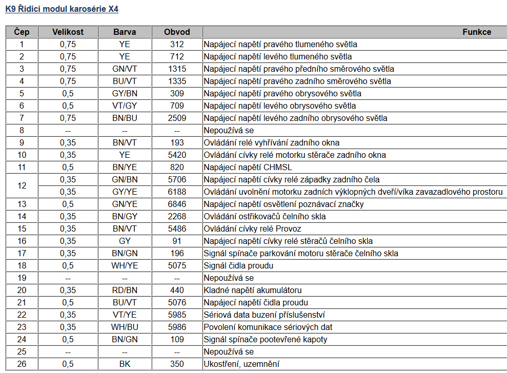 Takže resume. V motorovém prostoru je akorát spínání dálkových světel a volný průběh kabelů pro potkávačky a obrysovky. Tam nic nelze udělat. Vše je v kabině, řídící jednotka K9, konektory X4 a X5(jeden signál zadní). Odpojování by muselo být vícepólové, protože spínací relé světel a obrysovek obsahuje přímo kabinová jednotka. Viz. obr. výše.