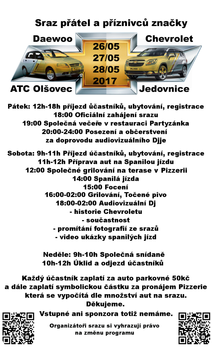 Na srazu jsou vítáni všichni majitelé a příznivci značky Chevrolet takže určitě přijeďte