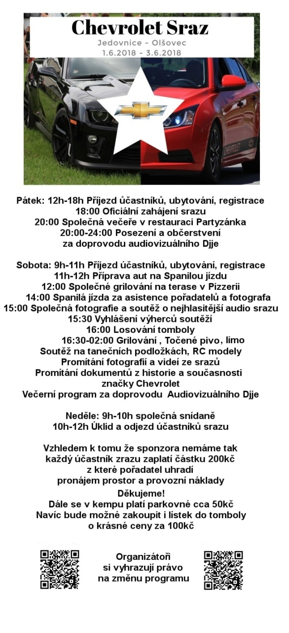 Přátelé na srazu bude možné si zakoupit za 100kč lístek do tomboly kde hlavní cenou bude pár kousků vlajek chevrolet na přední kapotu vašeho vozu. K prvním 20ti lístkům navíc obdržíte jako dárek reflexní proužek. Tak neváhejte, vlajka má rozměr cca 150x90cm a má logo doplněné americkou vlajkou.