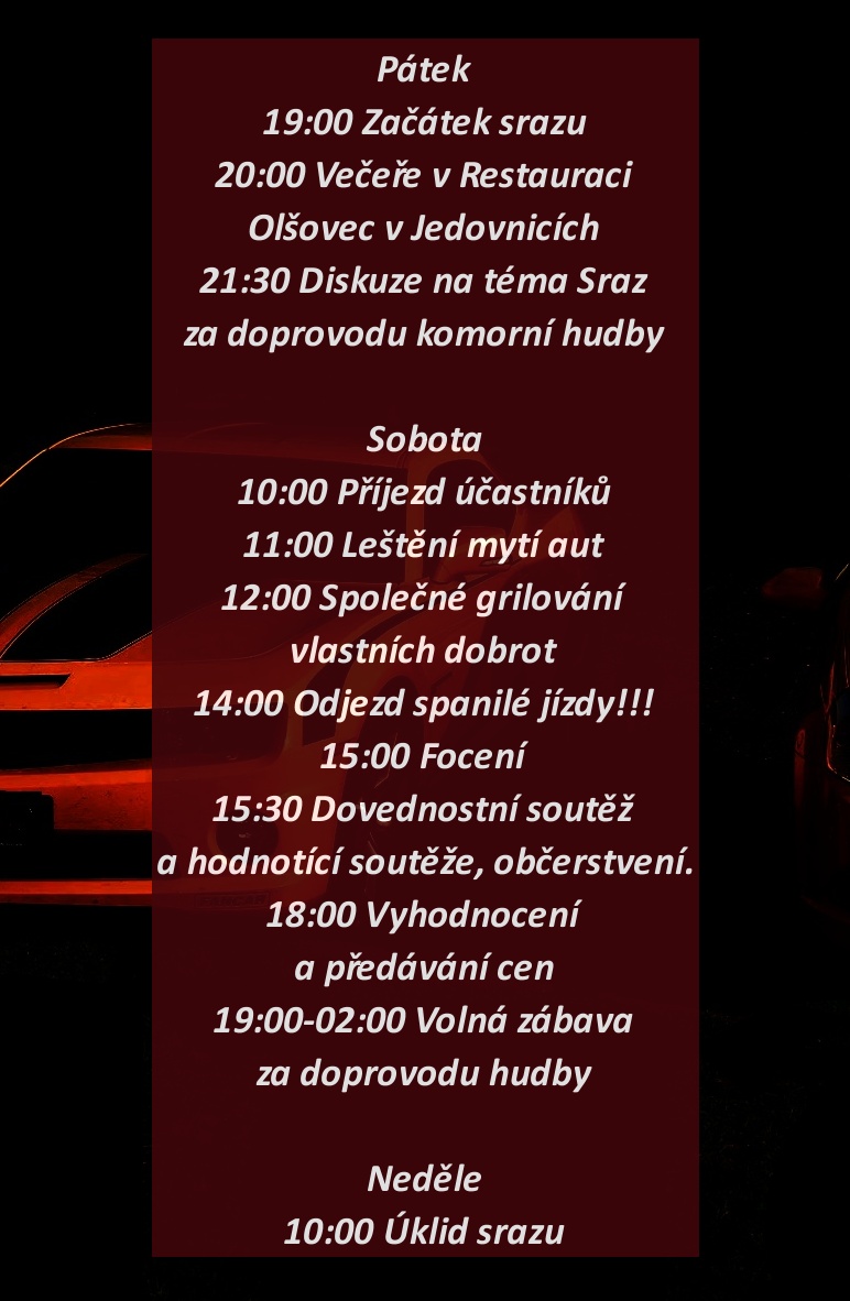 Pokud by někdo chtěl dojet ještě v pátek večer a zúčastnit se i zahájení srazu se společnou večeří budeme rádi. Jinak večeře bude kolem 20:00 hodin přímo na náměstí v Jedovnicích restaurace Olšovec, tak kdyby to náhodou časově někdo nestíhal, tak dojeďte přímo tam, kde nás určitě najdete