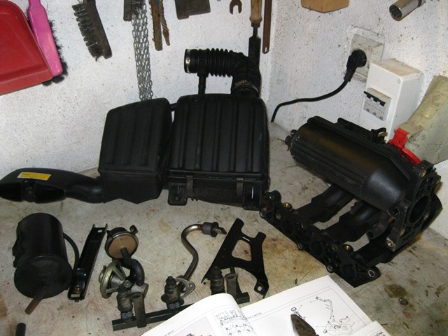 Pridávam foto sacieho potrubia, obnažených kanálikov na bloku motora a fotku všetkého, čo som vytiahol.