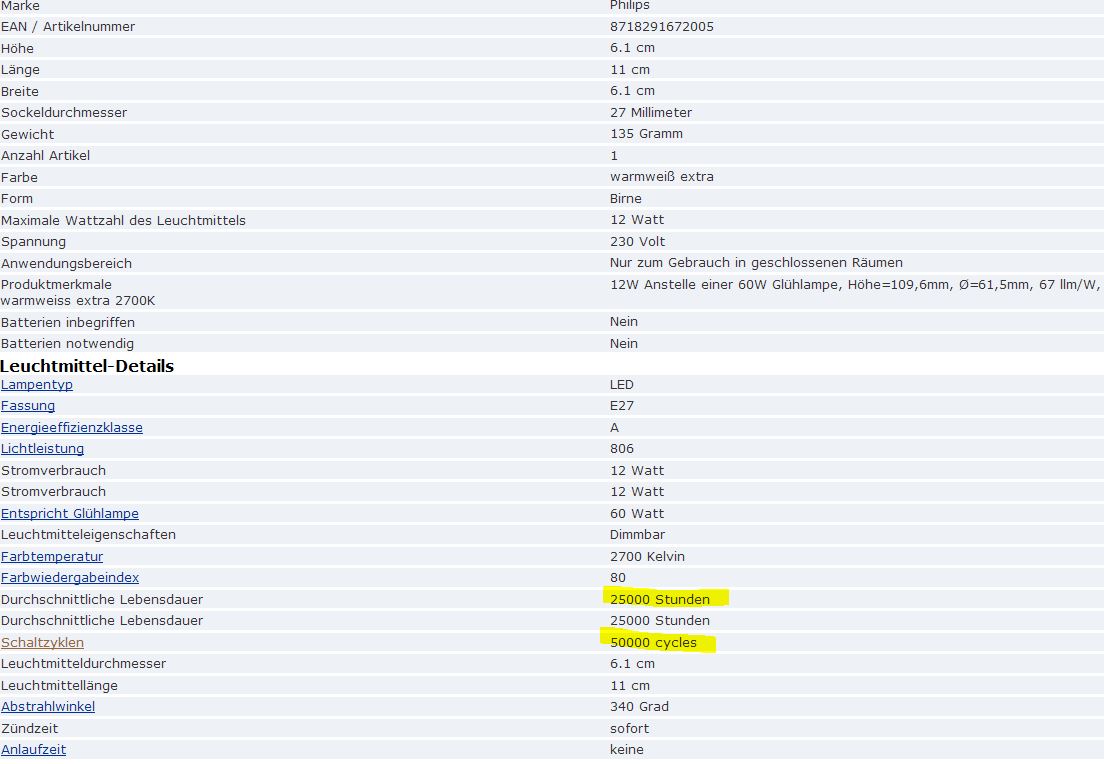Ta tabulka to je priklad,jsou zarovky co maji,pres 200 000cyklu a pres 100 000hod svitivosti,ale ty nekopis v Lidlu za 2. €.