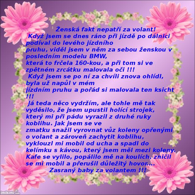 Když jsem se po ní za chvíli znova ohlídl, byla už napůl v mém jízdním pruhu a pořád si malovala ten ksicht! Já teda něco vydržím, ale tohle mě tak vyděsilo, že jsem upustil holící strojek, který mi při pádu vyrazil z druhé ruky koblihu. Jak jsem se v tom zmatku snažil vyrovnat vůz koleny opřenými o volant zároveň zachytit tu koblihu, vyklouzl mi mobil od ucha a spadl mi do kelímku s kávou, který jsem měl mezi koleny. Kafe se vylilo, popálilo mě na koulích, zničil se mi mobil a přerušil důležitý hovor. Zasraný baby za volantem...
