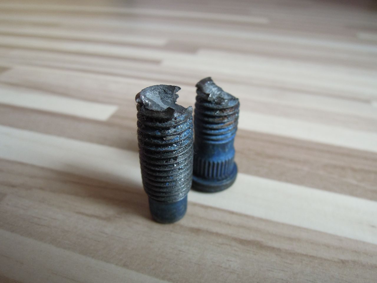 Lenže doťahujem na pravom prednom kolese skrutku a už sa mi zdalo divné, že to nejak ľahko ide aj keď už som cítil, že dosadla na disk. Ale doťahujem s momentovým kľúčom, tak reku nedá sa nič pokaziť. A zrazu jemné puknutie. Vedel som, že je zle :? Nechcelo sa mi veriť, že by som strhol závit, veď matica ešte vôbec nešla ťažko a k tomu momentový kľúč. Chcel som vykrútiť som von maticu, ale tá už vyšla aj so značnou časťou skrutky :cry: