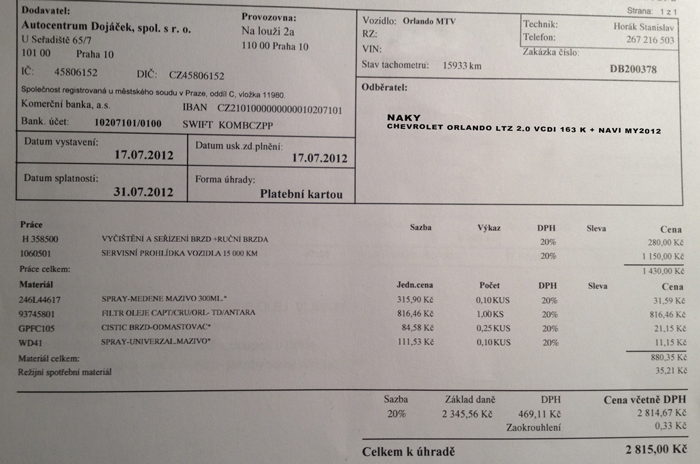 Prohlidka u Dojacka za 2.815,- (jednotlive ukony a polozky davam do prilohy) - Auto mam od Srby, ale prohlidka tam byla drazsi..