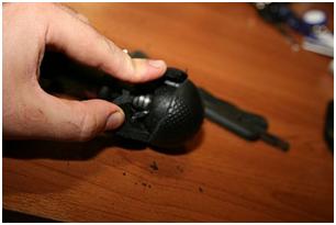 - 3.Takže teraz máme vymontovanú rýchlostnú páku. ( keď tak uvažujem práca na 2min a je to ideálna ochrana proti krádeži) Vyvlečieme z koženého obalu a môžeme pokračovať v kludne na stole.