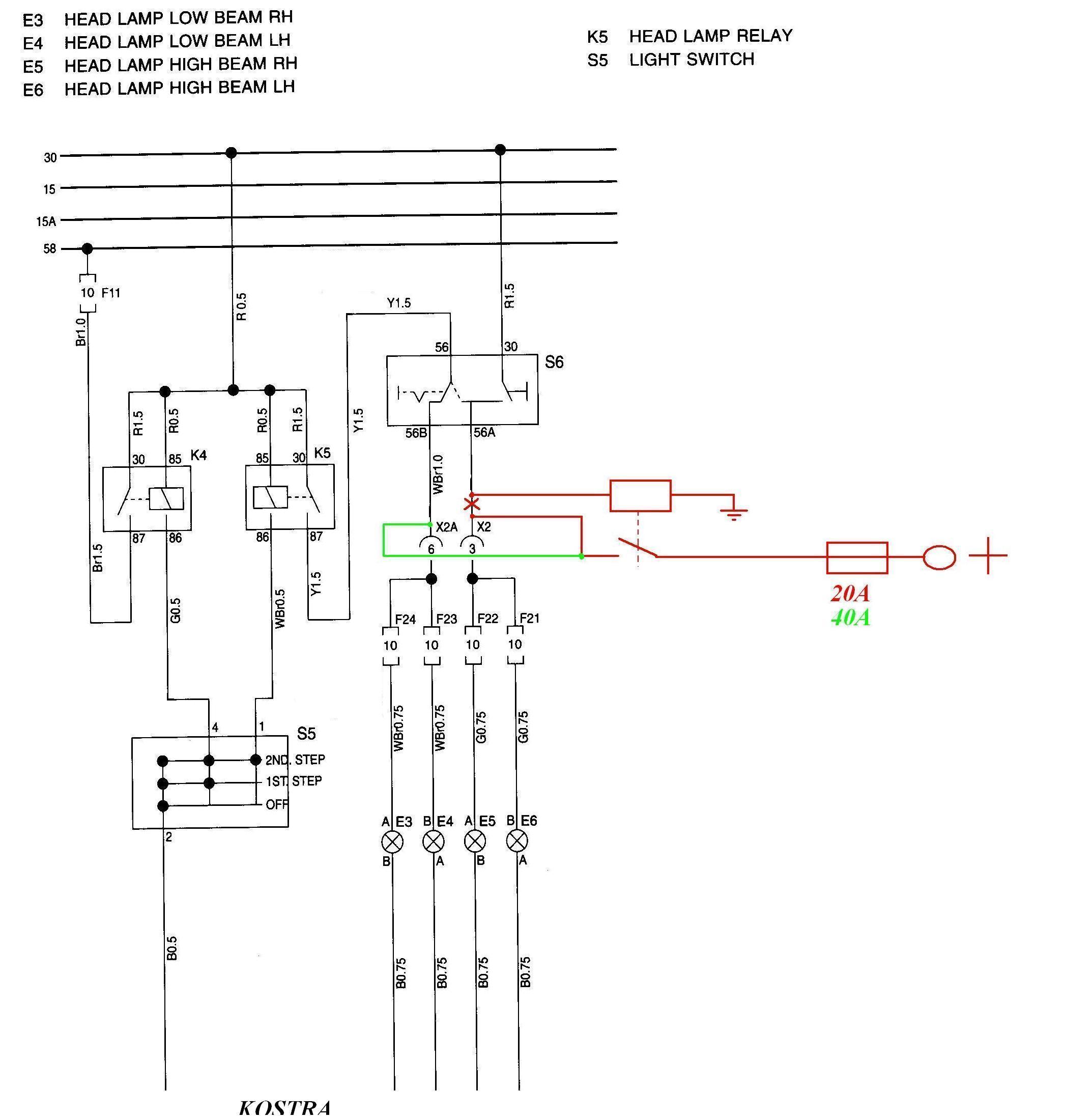Zelenou je možné rozšíriť svietenie diaľkových svetiel o stretávacie svetlá. Je však nutné patrične dimenzovať vodič a taktiež poistku. Ja to však budem pre istotu riešiť 2-ma relé, kedže nechcem riskovať zlepený kontakt.