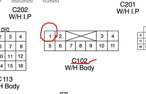 Podle zde uveřejněného schématu jsem se snažil najít vodič který vede k přepínači světel u volantu č.57. Na něj totiž nešlo napětí z relé.